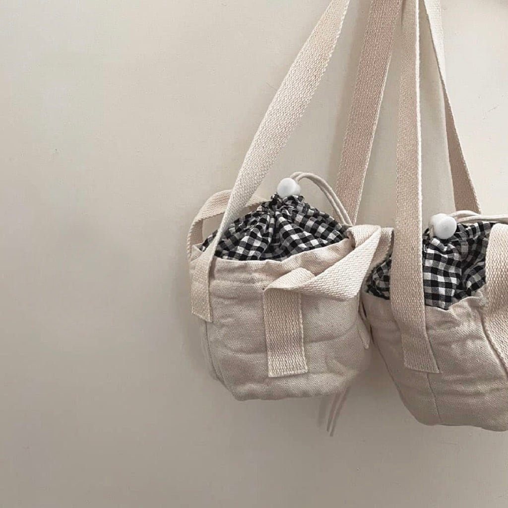 A totally lovely little bucket bag. The most perfect size for the little one in your life to carry a handful of their essentials. Featuring both shoulder strap  and handles, gingham pattern to the top and toggle closure. it's a total beauty!