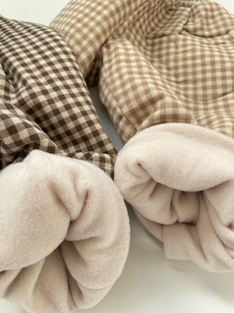 A thick and cosy pair of fine-corduroy, gingham trousers. With a relaxed fit, elasticated waist and a warm/snuggly fleeced lining.